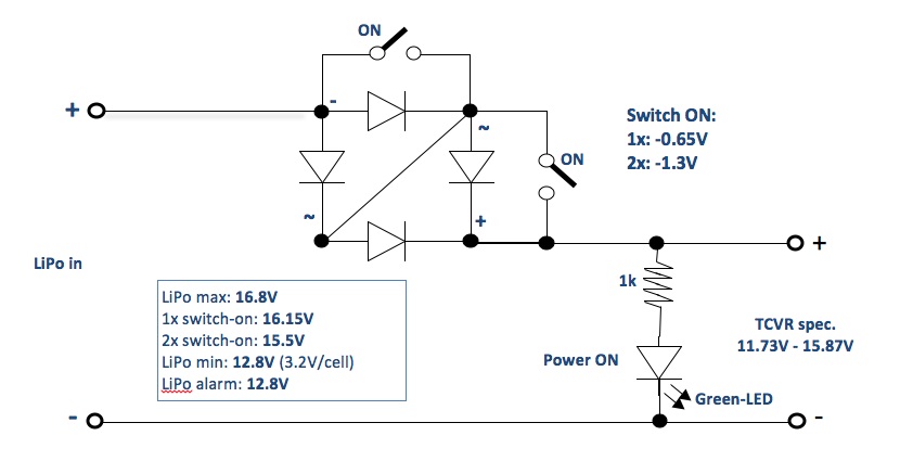 - Egy 4S LiPo-t hasznalok. Vagyis 4 drb elem sorban, persze gyarilag ami nominalis 14.8V. Ha teljesen feltoltom akkor magasabb feszultseget ad mint amit az FT-857 elfogad, szerencsere csak egyszeruen nem kapcsol be. Egy egyszeru aramkorel megoldotam.